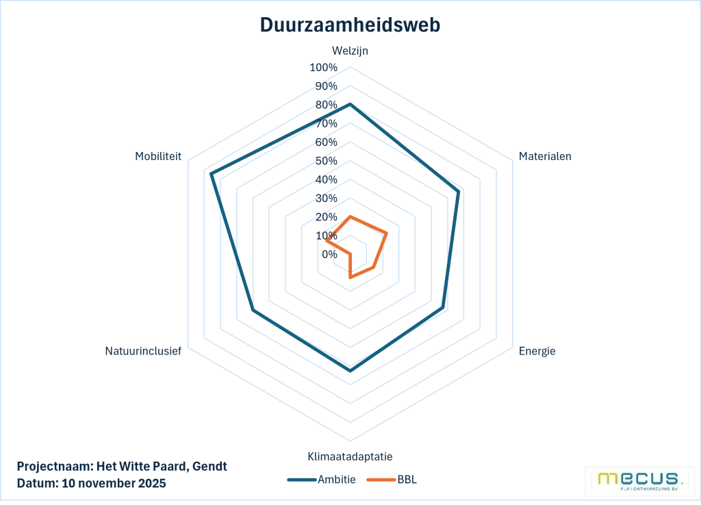 Het Duurzaamheidsweb biedt een krachtige en overzichtelijke manier om de duurzaamheidsambities van een bouwproject inzichtelijk te maken. Het model is opgebouwd uit zes essentiële pijlers, die samen een compleet beeld vormen van de impact en toekomstbestendigheid van een ontwikkeling: